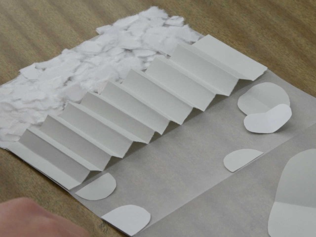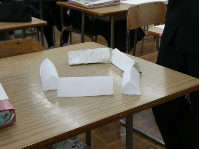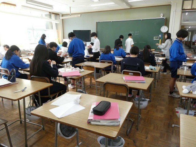「未来の自分」をイメージした作品を画用紙で制作中です。「努力の後には明るさがある…」生徒の発想はどれもユニークで、難しさの中におもしろさの宿る授業展開です。