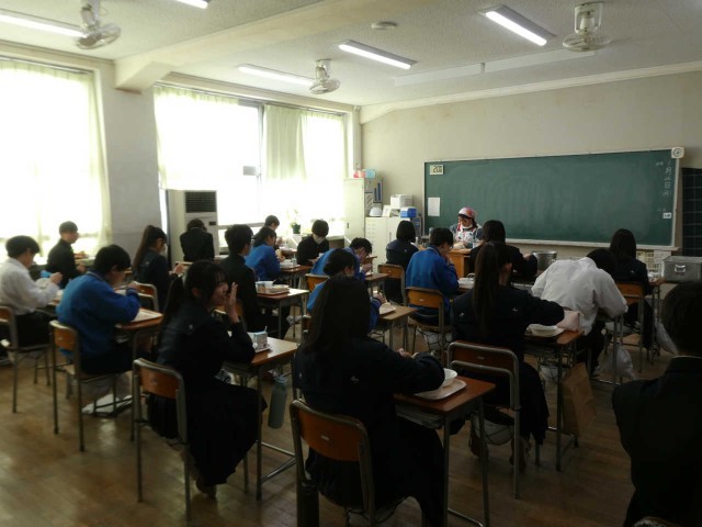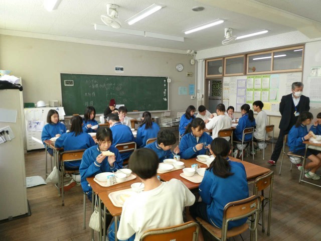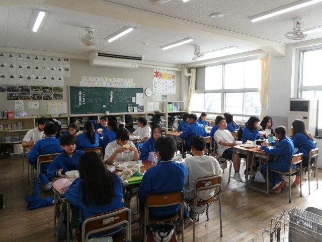 1年生、3年生の給食風景です。「仲良きことは 美しき哉」給食を食べてるときの生徒の表情はにこやかです!「食パン、白菜のクリームシチュー、ミートボール、湘南ゴールドジャム」をおいしくいただきました。