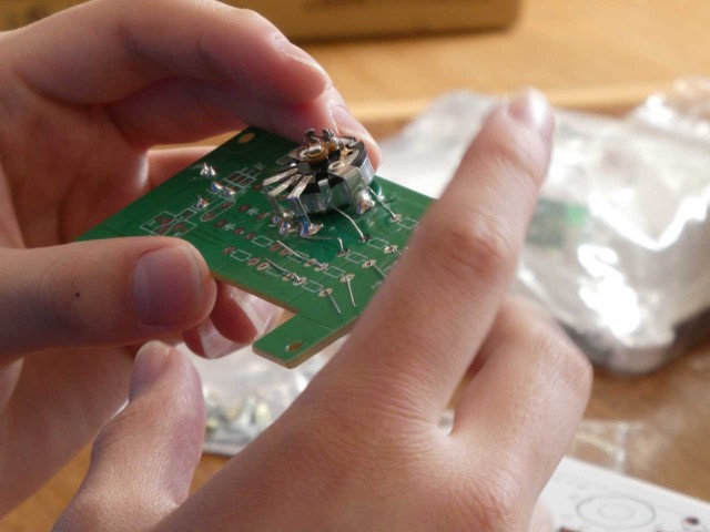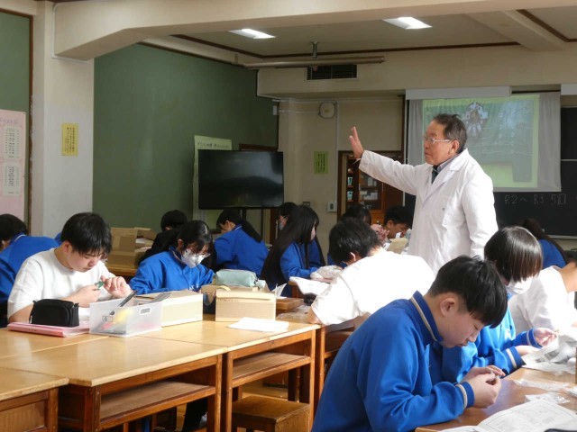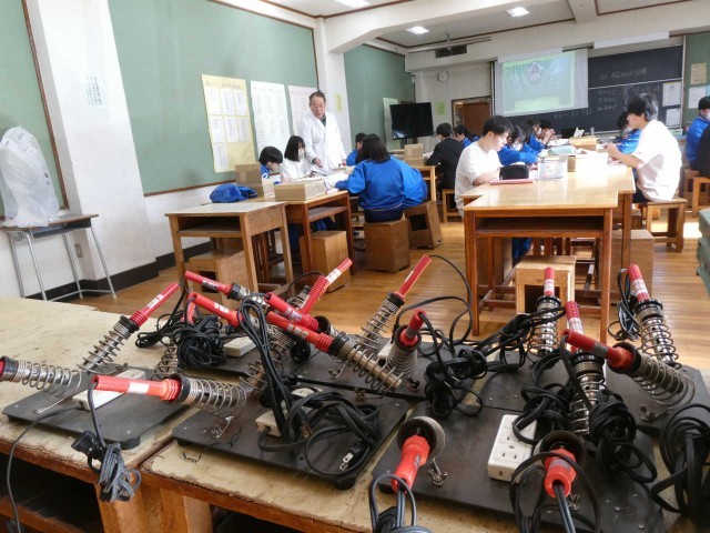 「部品さしとネジ分類」がテーマです。LED行灯の心臓部分となる電子基板の制作に入ります。ネジが一つ足りなければ基盤が取り付けられません。部品を扱う生徒の表情にはいつもより真剣さが増していました。