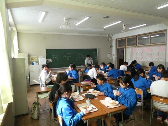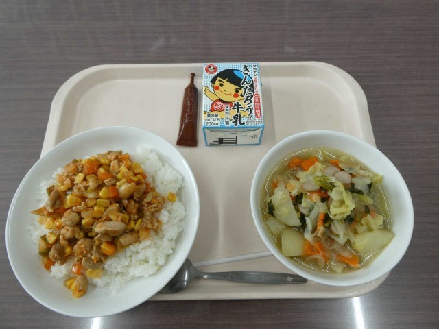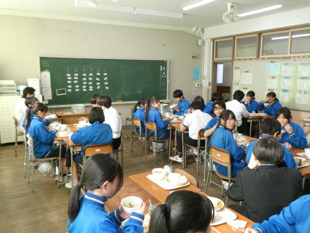 本日の献立は「まぜまぜチキンライス、野菜コンソメスープ、ミルメークココア」です。写真は2年生の風景です。生徒にとって楽し気なメニューとなっていました。とても美味しく睦月最終の給食をいただきました。