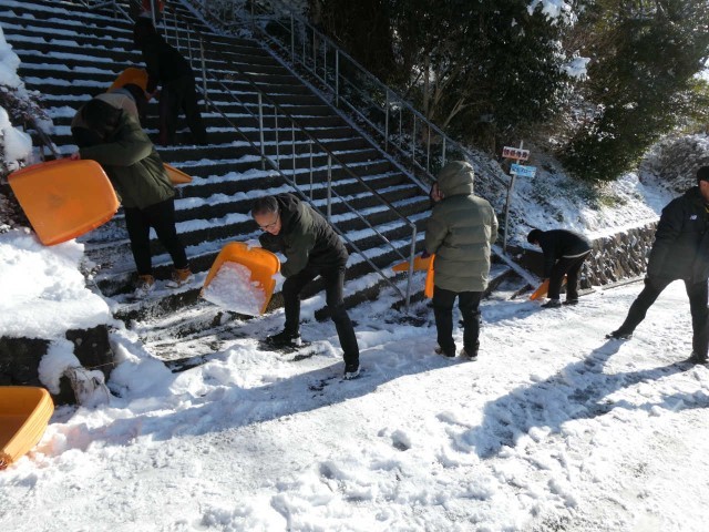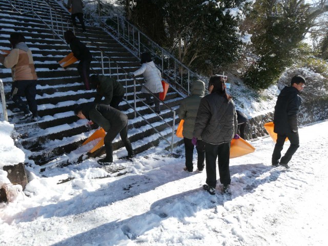 生徒の登校に備え、学校職員で坂や階段の雪かきをしています。勾配が急な城南中学校は歩行にも注意が必要になります。