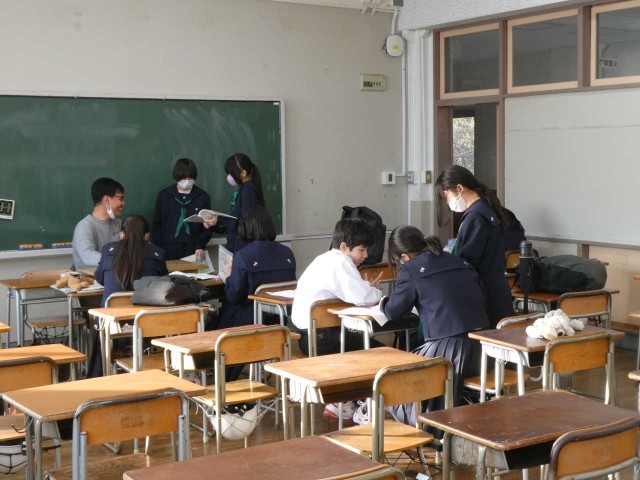 数学の学習会の風景です。教室には冬から春へ向かう陽が差し込んでいました。いつもより先生との距離が近づき、より丁寧に勉学に励むことができているようです。「学び舎」と呼ぶにふさわしい教室の雰囲気です。