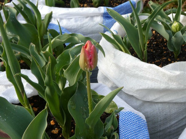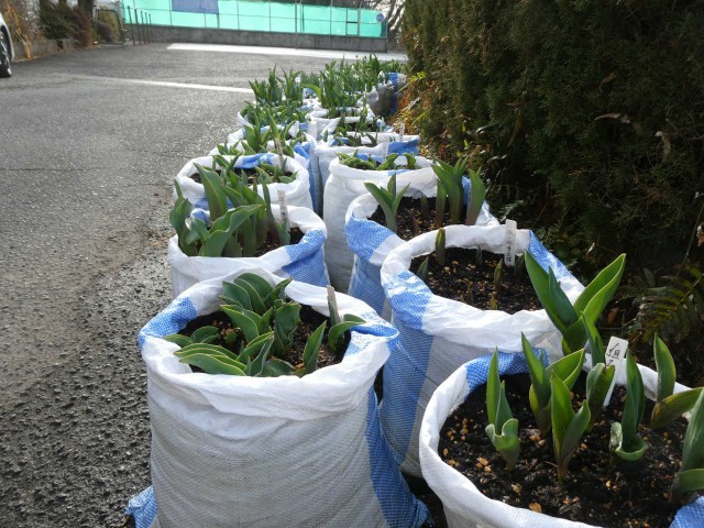 春を待つバス停。チューリップたちも春の到来に備え満を持している状態です。冬来たりなば春遠からじ、もうそこまで「春さん」は来ている感じの朝です。