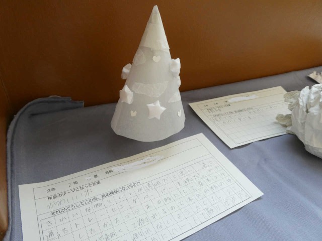 「紙と自立する自分」をテーマに「白いオブジェ」が授業の中で完成し展示中です。心の世界が表現されているようで、解説を読ませてもらうとその作品の意味が理解でき、作者の心情が伝わってきます。写真は「理想のベッド」と「かわいい木」です。