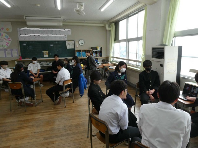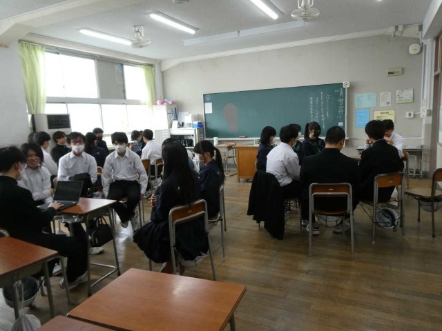 自分で探究を深めた事柄についての発表会です。学習用端末を用いて班員に「自分の推し」を楽しそうに語る姿があります。おだやかな教室の雰囲気が印象的でした。