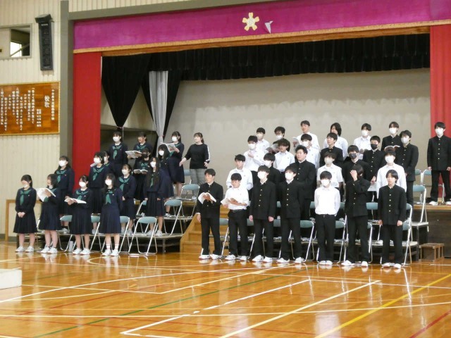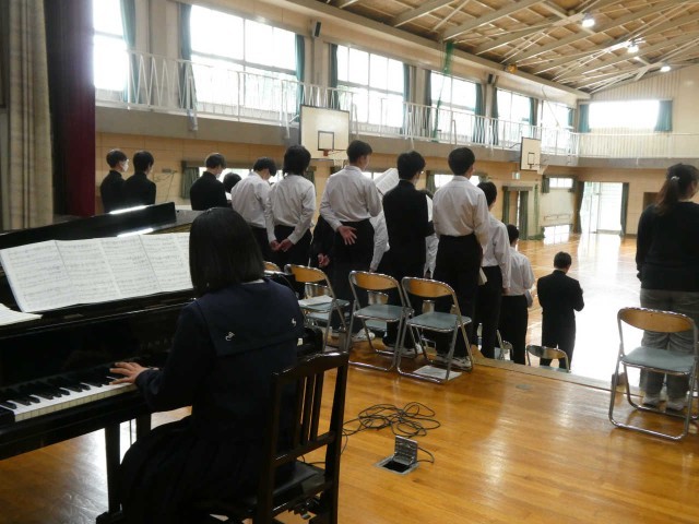 体育館では卒業式に向けての合唱練習が展開中です。指揮者やピアノ伴奏者は孤独を味わいつつも、仲間の歌声を力に変えているようでした。