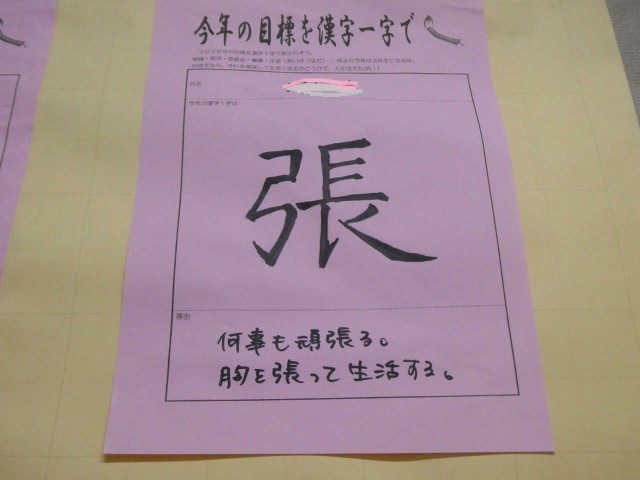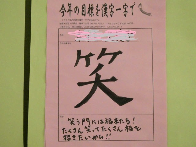 2年生廊下壁面の掲示です。「今年の目標を漢字一字で」がテーマです。「耐」に共感しました。