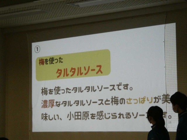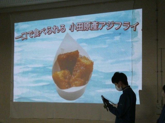 小田原でとれる魚を使っての料理を考案し、本時はその発表会です。「一口で食べられる小田原産アジフライ」には梅入りタルタルソースも添えられ、人気商品となりそうです。スライドの出来ばえも素晴らしく、ハイクオリティの発表会となっています。