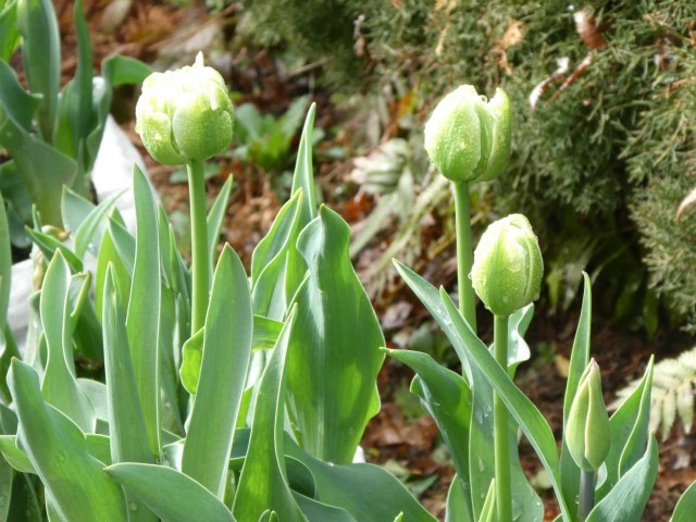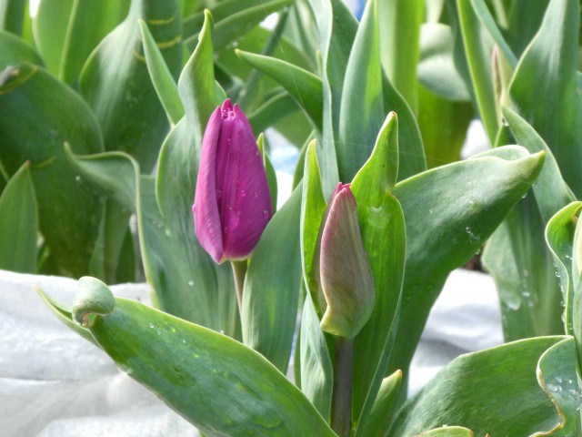 春雨を受け、チューリップたちは一層瑞々しく輝いています。お花を眺めていると、気持ちがおだやかになります。