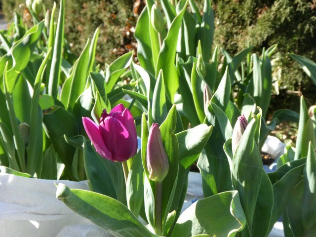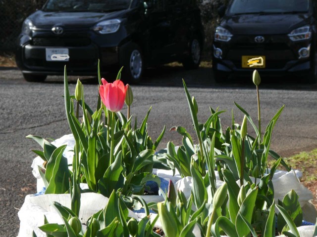 紫、黄、朱、少しずつ花を咲かせるチューリップが出てきています。「あせらず、ゆっくり」をテーマにチューリップ畑では、仲良く2月を終えようとしています。