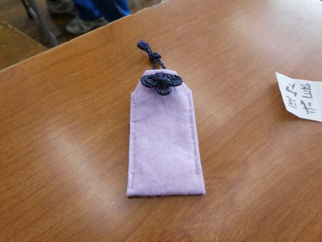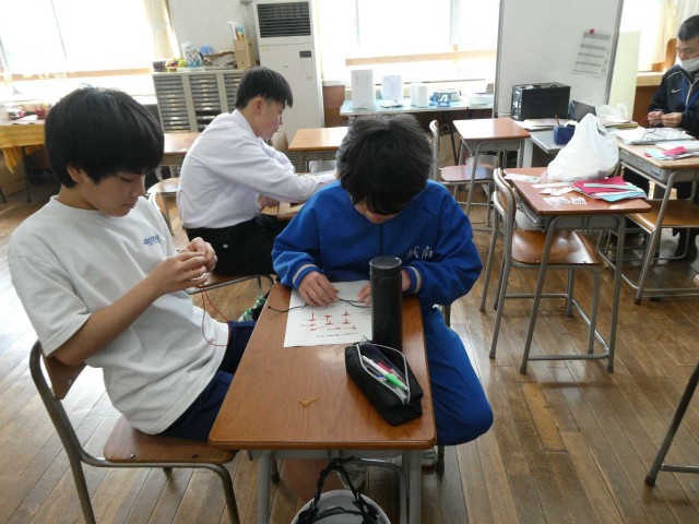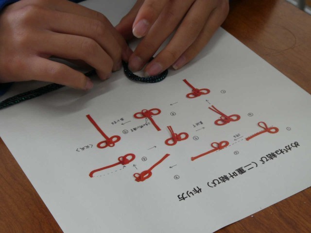 卒業生への贈り物を制作中です。「めがね結び」、完成すると、とても美しい形になります。意外に難しい結び方で、作業には時間が必要なようです。一生懸命に作業に集中していました。
