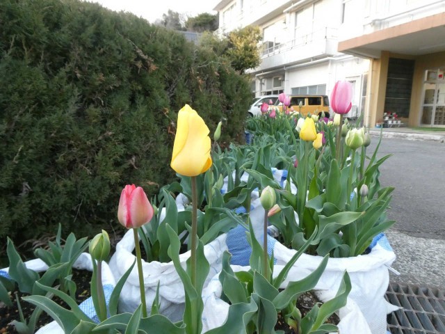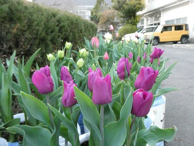 虫が出て来る頃、夕暮れどきは少し寒さを感じます。チューリップは朝、昼、晩、とその彩りを、背景に合わせ輝きながら佇んでいます。