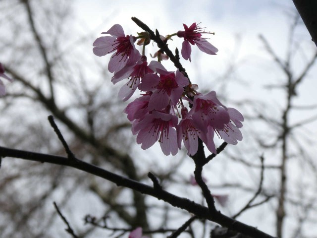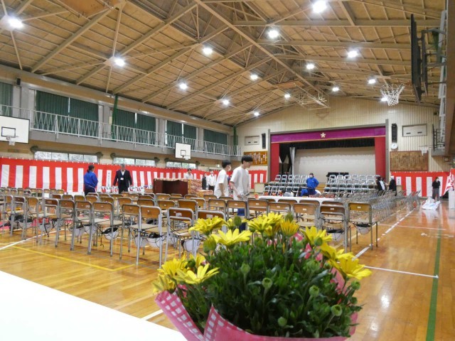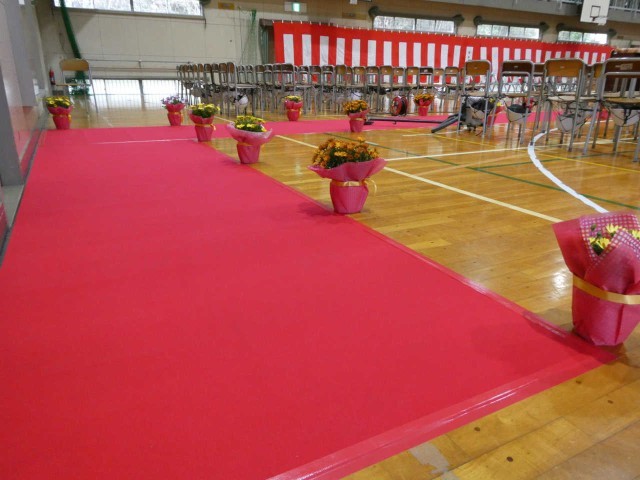 「卒業の花道」が赤じゅうたんと鉢花により整然と完成しました。入口のオカメ桜ももちろん花道の仲間です。