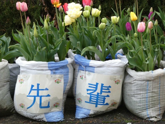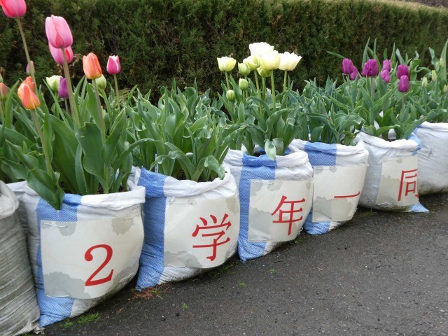 2年生が技術科で栽培のチューリップ園も明日の卒業式をお祝いしています。「先輩ありがとう」の文字がお花とともに感謝の気持ちを伝えます。
