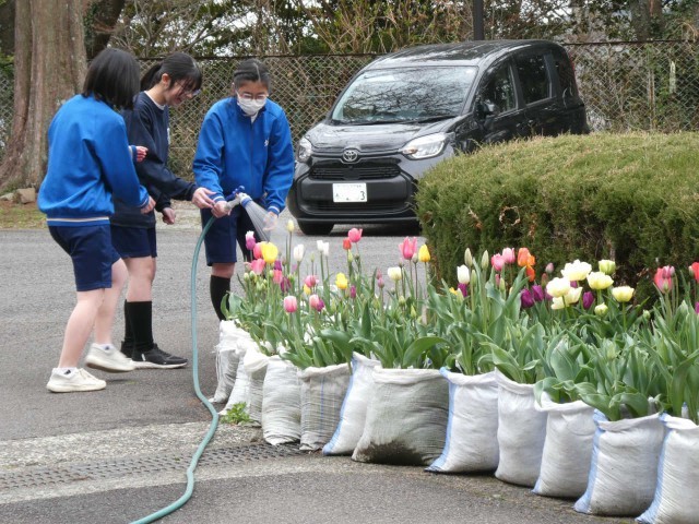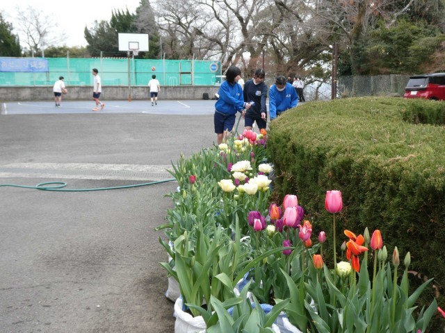 三者面談2日目です。放課後、チューリップに水をあげる2年生の姿がありました。ブルーコートではバスケットボール部が躍動中です。