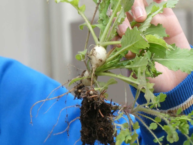 ふれあいファームでは土を耕し、畝を作る作業中です。簡単なようで、コツと力が必要な作業です。かわいいカブの収穫もありました。「土をつくる」ことは作物の栽培で一番大切なことかもしれません。