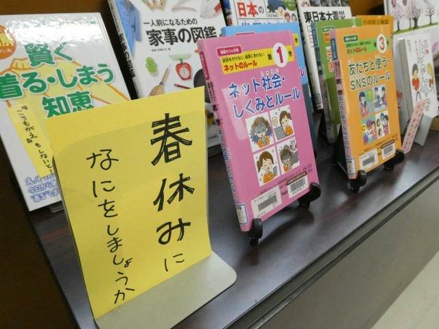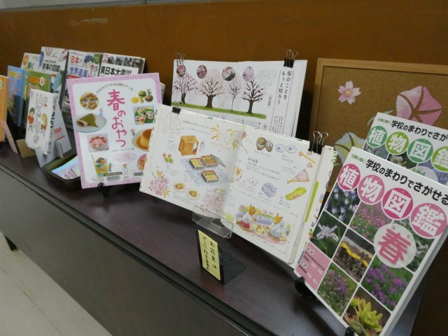 職員室前廊下が春色に光っています。学校司書さんが季節の本を選定して展示してくれました。心が疲れたときに、そこを通るだけで、ホッとできる空間が広がっています。もうすぐ開花宣言です!