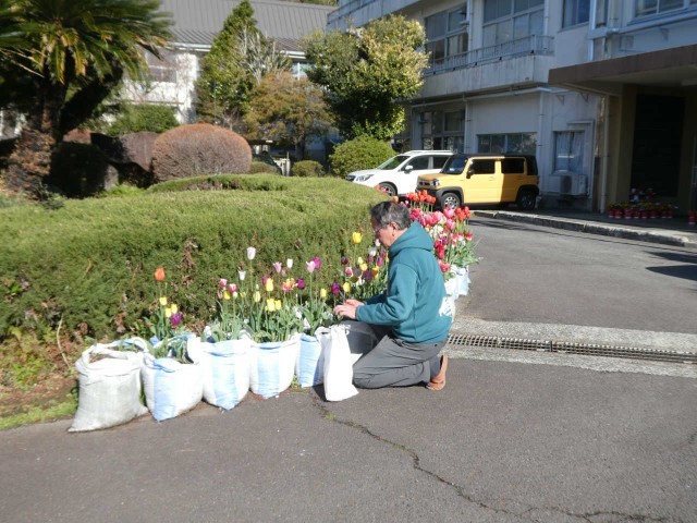 2年生が技術科で栽培のチューリップの彩りが春色を演出してくれます。指導教諭は入学式に向け「入学おめでとう」の掲示を、鉢に施す作業中です。「花に水、人に心」が蘇りました。それにしてもチューリップの姿勢のよさに身が正されます。