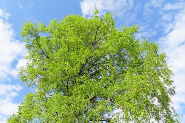 雨上がりの朝、樹高約20メートルのセコイアが本校の生徒を出迎えるかのように、いきいきとした青葉を茂らせ始めました。