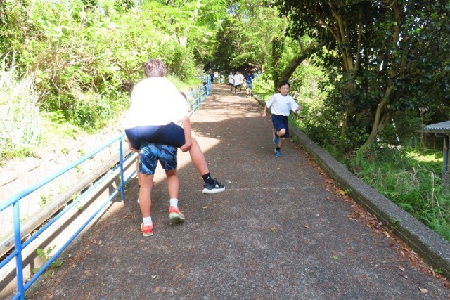 総体に向けてテクニックを支えるフィジカルを向上させようと、仲間をおんぶで背負ってスロープを登っています。やり切れば、きっとメンタルも鍛えられるでしょう。