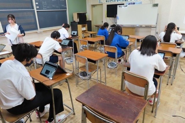 英語話すこと調査に挑戦しています。マイク付きヘッドフォンを装着して、画面を見ながら英語で答えようと奮闘しています。