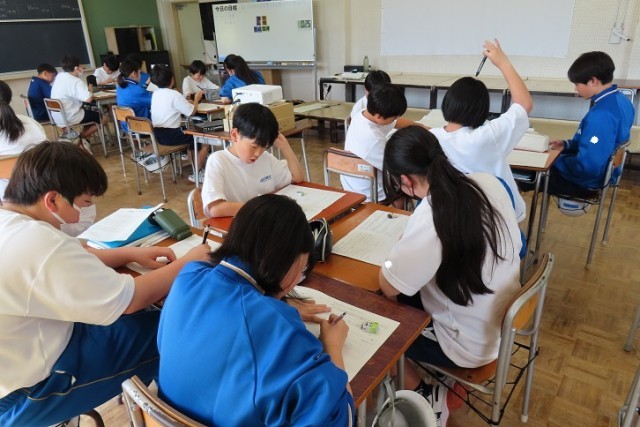 音楽の鑑賞の授業です。先生から与えられた課題をクリアしようと4人の少人数グループでアイデアを出し合いながらクリアをめざしています。
