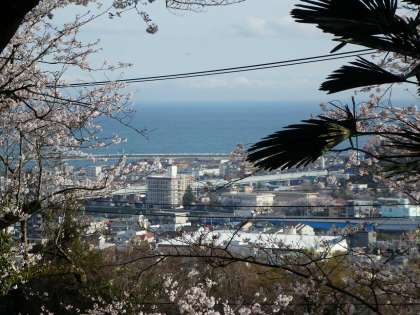体育館ではバドミントン部が練習中です。戸の外に目を移すと、桜の木々が額縁となり相模湾が水色に輝いていました。生徒たちはこの風景に包まれて下校して行くのでしょう。練習の疲れを癒やしてくれる景色です。