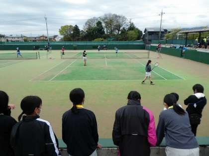 テニスガーデンでも元気にラケットを振るテニス部員の姿がありました。仲間を拍手で応援するチームのあたたかい雰囲気があります。4月にしては肌寒い気候ですが、選手たちは「お腹が空いた…」と心身ともに健全な様子でした。誰もが粘り強くボールを追う姿が印象に残りました。