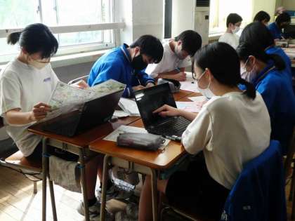 3年生は京都奈良、1年生は上野について学習中です。学習用端末と人の声がバランスよく融合して授業が構成されています。画面で見ていたものを現地で実際に見ることで心に響く学びとなるのでしょう。