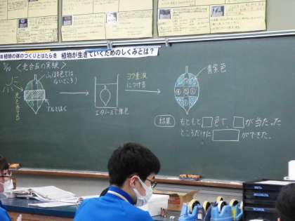 2年生理科では「光合成」について学習中です。光を源として「デンプン」を合成する。植物の優れた能力です。人間は光を元に何かを作り出すことができるのでしょうか…?もしできるのなら「他者に対するやさしさ」であってほしいです。