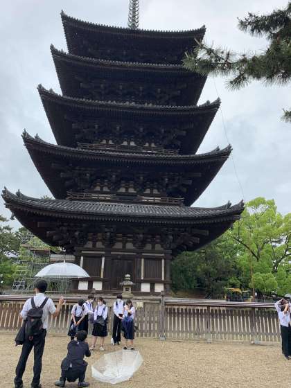 興福寺にて 五重塔前で班ごとに写真撮影。 これからバスで平等院に行きます。