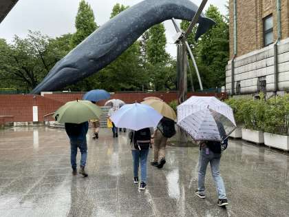 お昼ご飯は国立科学博物館の中で食べる班もあれば、動物園で食べる班もありました。国立科学博物館から移動するときに「雨が降っていなければこのクジラの前で集合写真を撮りたかったなぁ」という声もありました。大きなモニュメントに感動していました。