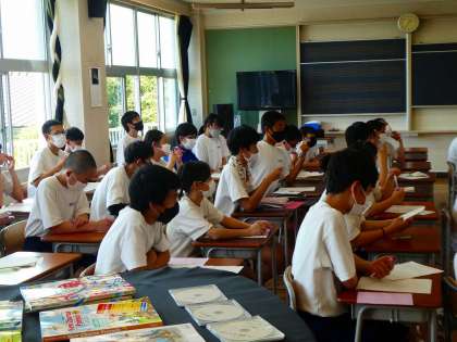 「音楽のない人生などありえない…」風鈴が心地良よく響いている音楽室。しかし教室の暑さはただごとではありません。「暑いといったら100円…」生徒はその言葉を覚えていたようで指導教諭も「そんなことばかりしっかり覚えていて…」と苦笑い。暑さの中にも和気あいあいとした優しい風が吹き抜けていました。