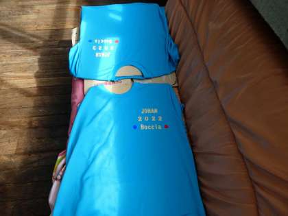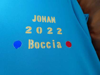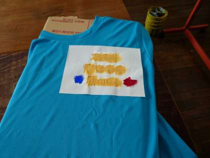 きれいなプリント文字が青いシャツに浮かび上がりました。すべてが生徒、職員の手作業によるものです。美しい色彩に触れると気持ちもキレイになるような感じがします。ボッチャ大会での健闘を祈ります!