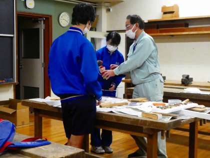 ドリルを使う場面です。最初に練習をしてから、看板の製作に臨みます。ドリルの使用には緊張感も伴いますが、指導教諭はユーモアを交え分かりやすく使用法を伝授していました。