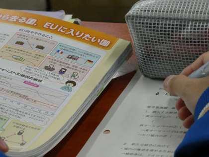 1年生社会科では「ヨーロッパの工業とEU」をテーマに授業が展開されています。教科書、ワークシート、板書・世界地図…、とても分かりやすい授業環境です。今の時代、世界情勢を学ぶことはとても大切だと思いました。