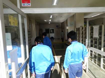 昇降口の大掃除の様子です。すのこや傘立てを外に出し、普段できない隅々までキレイにしています。床を黙々と磨く姿もあります。「あいさつと掃除ができる学校」がよい学校だと思います。