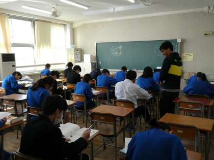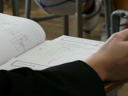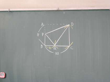 3年生数学科の授業風景です。長方形を折り返す問題です。実際に長方形を折ってみると、ヒントがつかめるかもしれません。生徒たちは集中して課題に臨んでいました。