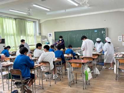 今日の献立は麦入りご飯、鰆の利休焼き、肉じゃが、牛乳です。利休焼きは肉や魚の表面に練りごまや炒ったごまで作るタレをぬり焼き上げたものです。名前の由来は、千利休が好んで料理にゴマを用いたことからこうよばれるようになったそうです。