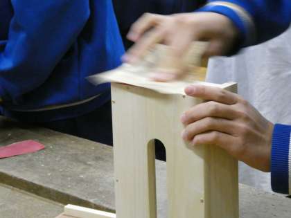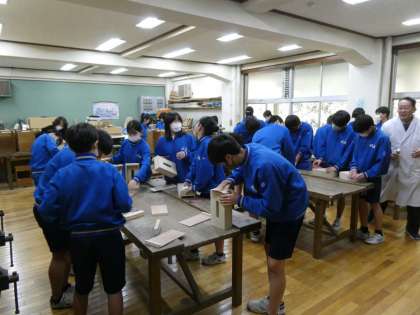 本時が今年度最後の授業です。黒板には「ティシュBOX完成」とありました。ヤスリで磨きをかけ、BOXをつるつるにしています。自分の作品に愛情を注入しているように映りました。