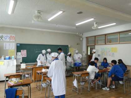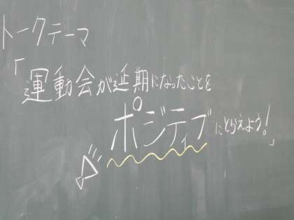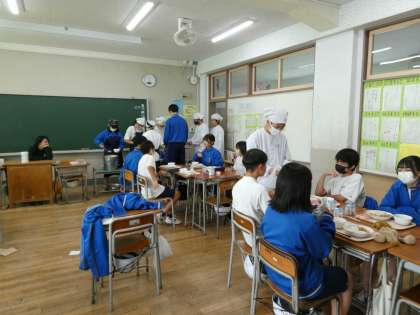 3年生の給食準備中の風景です。黒板にとても元気が出る言葉が書かれていました。給食を食べて元気百倍です!