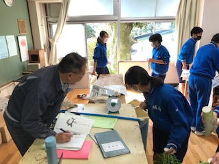 中写真:ノギスを使って径を図ります。さすが技術科。ノギスの目盛りの読み方は絶対にテストに出るはず。