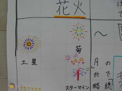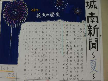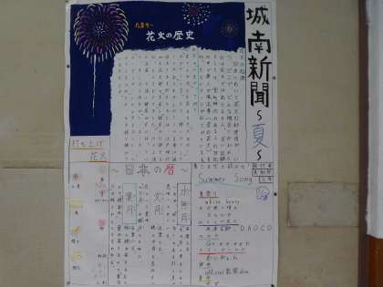 美術室前には「城南新聞」が掲示されています。「花火の歴史」が書かれていて、読んでいると「夏休みの心」が浮かんできました。世の中にはパソコンの文字が多いので、手書きの文章に触れるとホッとします。