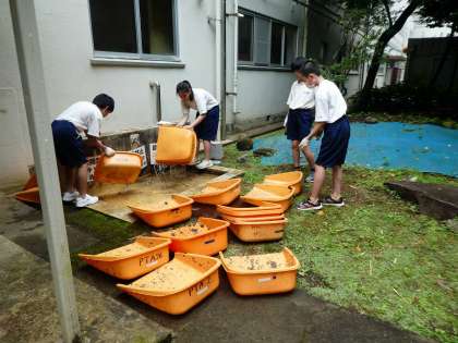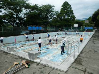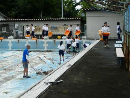 1年生がプール清掃に取り組んでいます。真面目な仕事振りで、見る間にプールがきれいになっていきます。泥を運んだり、みのを洗ったり地道な仕事も光っていました。スクボラの保護者の方々のご協力に感謝いたします。
