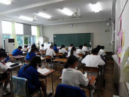 戦争について 公開日 2021/09/06 更新日 2021/09/06 できごと 1年生国語科では「大人になれなかった弟たち…」を題材に戦争について学習していました。戦争は人の身体と心を大きく傷つけ、一人ひとりの人生を狂わせてしまう悲惨なものであることがテープの声から伝わってきます。生徒たちの表情は真剣そのものでした。 いいね(0)