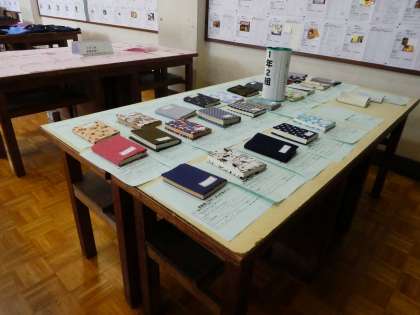 昨日の午後まで授業をしていた教室に、今日にはいろいろな展示物がきれいに並べられていました。ブックカバーやマグカップのデザインなど、丁寧な作りの個性たちが笑顔で迎えてくれます。