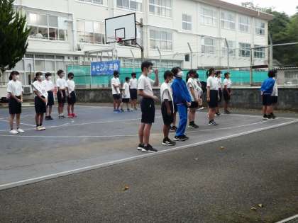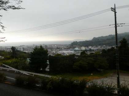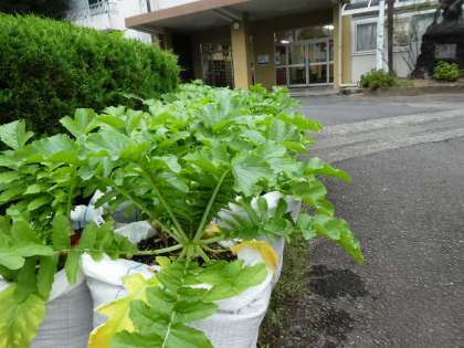 生徒会役員選挙の立候補者があいさつ運動をしています。その隣ではスクスクと成長を続ける大根の緑の葉が「がんばって!」とささやかに応援していました。今日は雨の予報が出ています。相模湾の向こうに陽があたっていました…。
