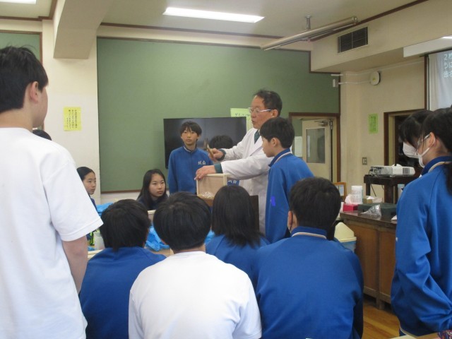 木製ティシュBOXの組立て作業がはじまります。釘打ちのポイントを教諭が丁寧に説明します。釘一本にも魂が宿ることを感じます。「玄翁和尚(げんのうおしょう)」と板書にありました。作業工程の中に深い学びと知識技能の習得が盛り込まれ、生徒の表情にも真剣さが増しています。