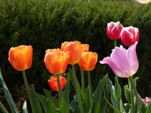 チューリップたちもこの暑さにびっくりしている表情です。オレンジ色が特に味わい深く見えた昼下がりの城南チューリップ園です。