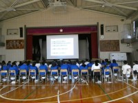 市職員の方々を講師としてお招きし「きらめき出前講座」が開催されています。本時は「公共交通の課題」がテーマです。やや冷え込みの厳しい体育館ではストーブが入り、体と気持ちを暖めながらの学習となっています。